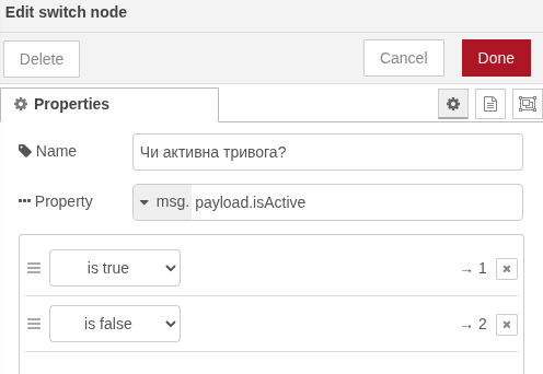 Якщо true — форматує одразу через шаблон, інакше спочатку переводить час у читабельний формат використовуючи компонент із залежності node-red-contrib-moment, після чого виводить повідомлення за шаблоном.