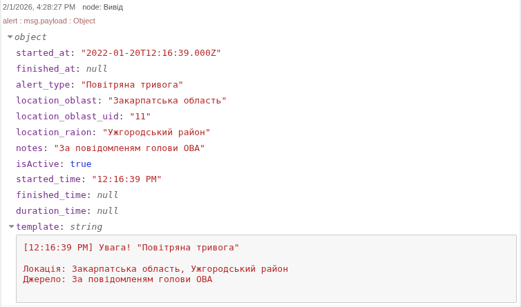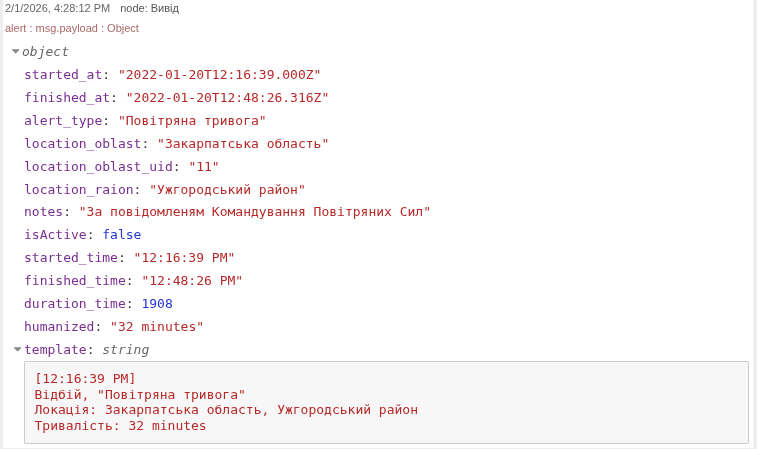 "func": "\nmsg.payload = `{\"id\":12,\"location_title\":\"Закарпатська область\",\"location_type\":\"oblast\",\"started_at\":\"2022-01-20T12:16:39.000Z\",\"finished_at\":\"2022-01-20T12:48:26.316Z\",\"updated_at\":\"2022-01-20T12:48:26.316Z\",\"alert_type\":\"air_raid\",\"location_uid\":\"11\",\"location_oblast\":\"Закарпатська область\",\"location_oblast_uid\":\"11\",\"location_raion\":\"Ужгородський район\",\"notes\":\"За повідомленям Командування Повітряних Сил\",\"calculated\":false}`\n\nreturn msg;",