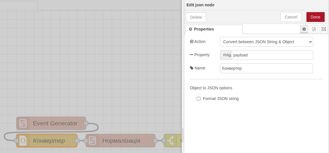 - Використовуючи відповідний вузол необхідно розпарсити вхідне повідомлення в object.
