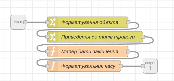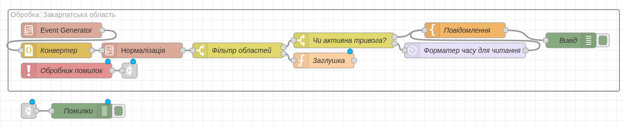Виконуючи практичну роботу було здобуто навички налаштування та використання основних вузлів в середовищі Node-RED, для створення ефективних потоків обробки даних на тематику повітряних тривог, де необхідно було нормалізувати вхідні дані та вивести їх за певним шаблоном.